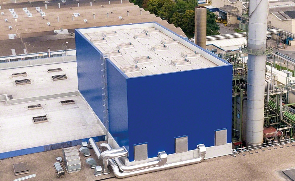 27 m aukščio sandėlis yra apkaltas statinys, t. y. atskirai stovinti konstrukcija, kurioje stelažai laiko savo pačių svorį, prekių svorį, šoninę apdailą ir stogą. Šio sprendimo privalumas yra tas, kad jis užpildo tik „Michelin“ pramoniniame komplekse esančią erdvę ir talpina 4 590 konteinerių.