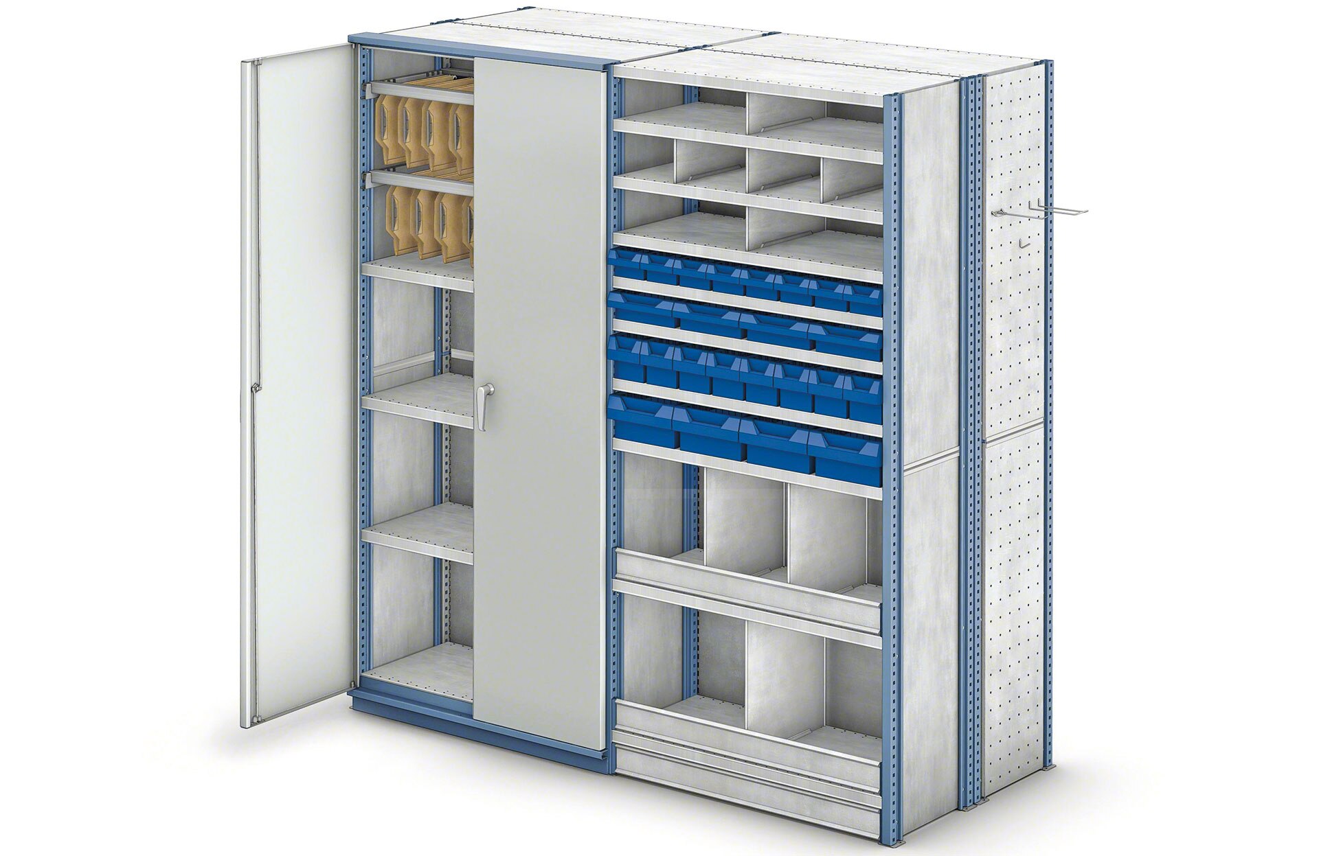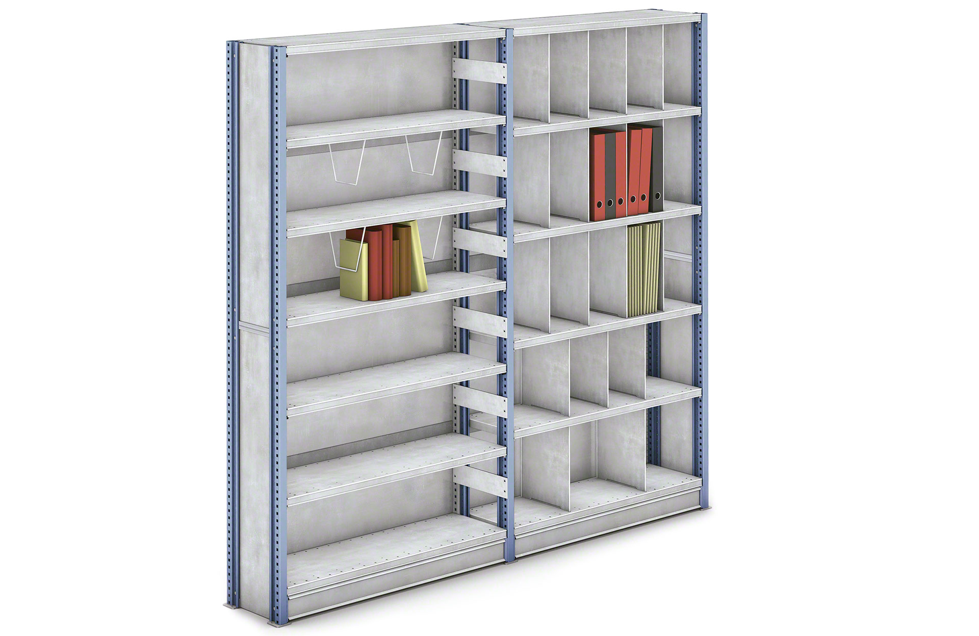 - Konfigūruojami ir pritaikomi: lentynų aukštį galima keisti, perkeliant lentynas 25 mm atstumu. Sandėliavimo sistemą galima lengvai išplėsti, pridedant papildomus skyrius ir aukščio lygius.