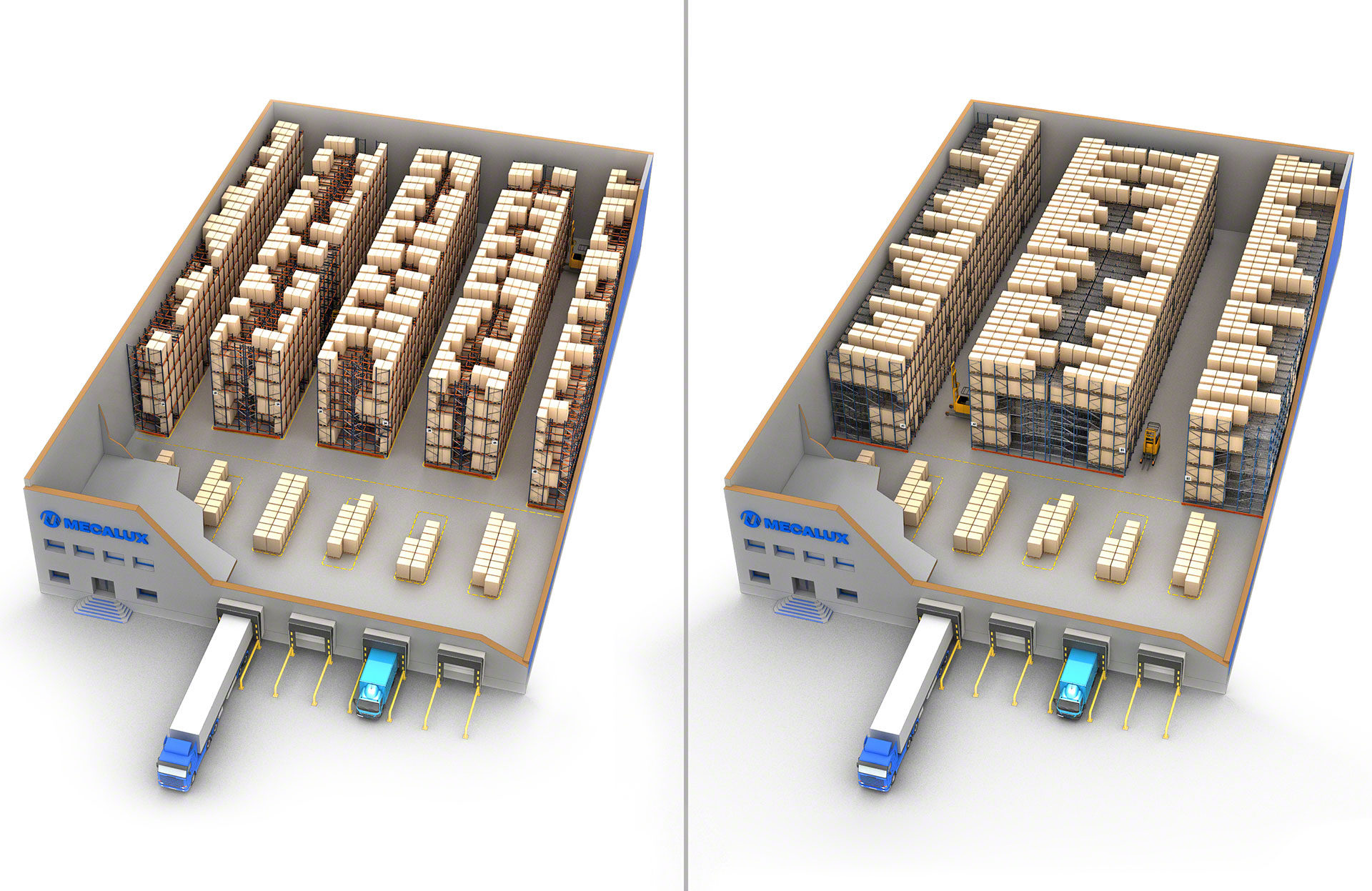 „Mecalux“ įstumiami paletiniai stelažai su vežimėliais gali talpinti nuo 2 iki 4 padėklų gilumoje, o naudojant ritininius konvejerius gali talpinti 4 ir daugiau padėklų.