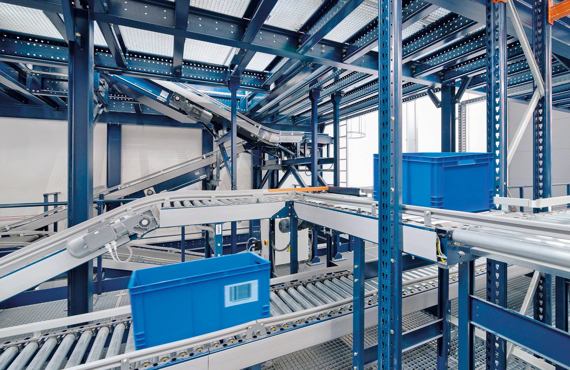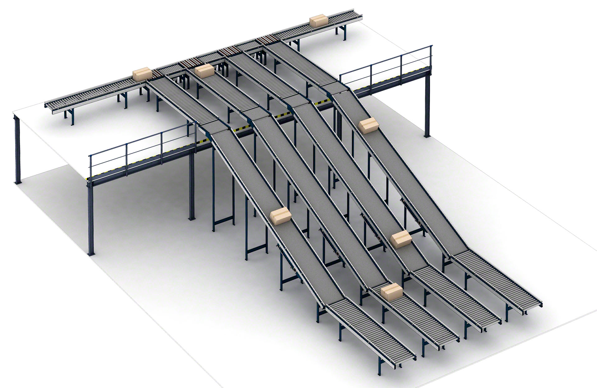 Taip, konvejerio linijos gali sujungti įvairius aukštus dėžių gabenimo konvejerio juostomis, taip pat vientisais arba nevientisais dėžių liftais.